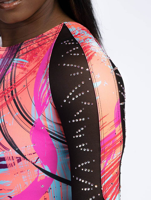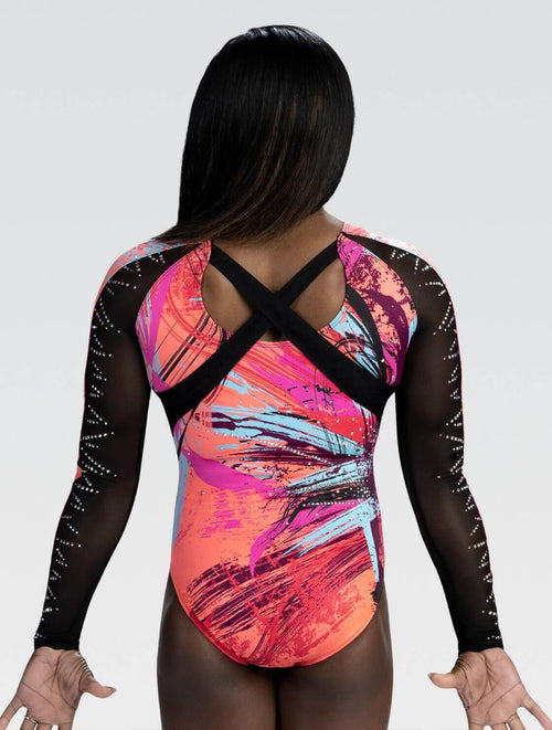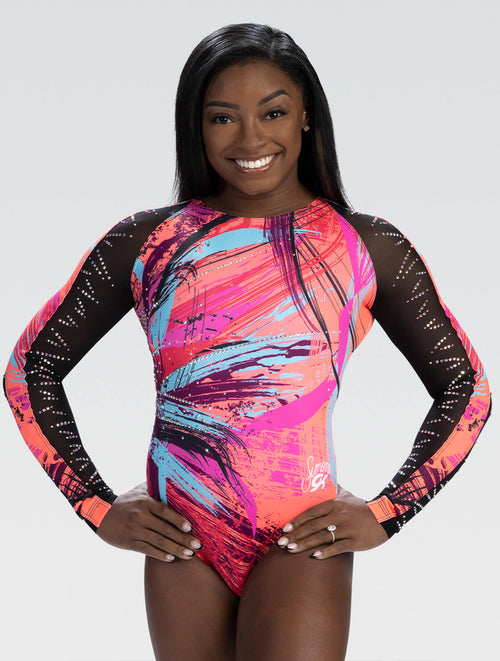 This bright and bold long sleeve competitive leotard designed by Simone Biles is full of life, just like the Olympic gymnast herself! Featuring mesh sleeves and crisscross back straps, this leotard was made to be shown off!
