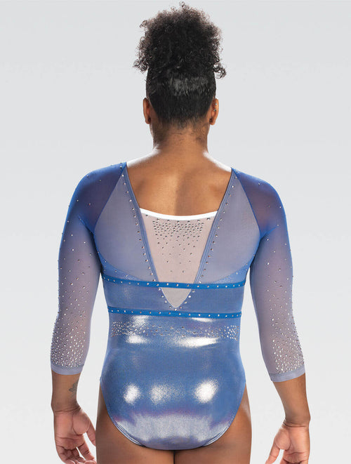 This long sleeve gymnastics leotard is ready to be shown off in the best way! Gear up for competition in this beautiful and elegant sublimated shadowed gymnastics leotard, complete with a banded belt and deep V-back.