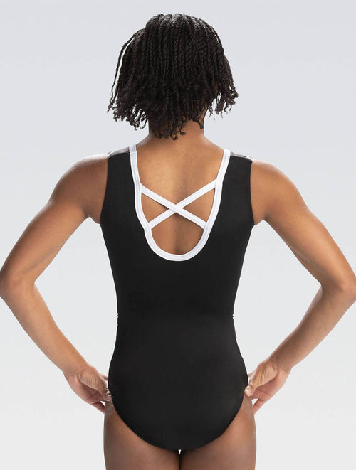 With a workout leotard like this one, it is no wonder why your whole team loves it! With a black and white chevron sublimated design on the front body and a super soft black back body, this accent strapped tank leo is training ready!Limited Availability, get it while it lasts!