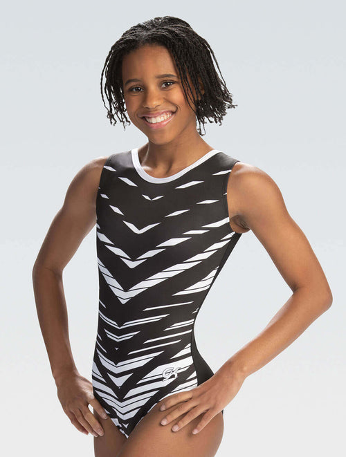 With a workout leotard like this one, it is no wonder why your whole team loves it! With a black and white chevron sublimated design on the front body and a super soft black back body, this accent strapped tank leo is training ready!| GK SIZE | TD | CXS | CS | CM | CL | AXS | AS | AM | AL | AXL |